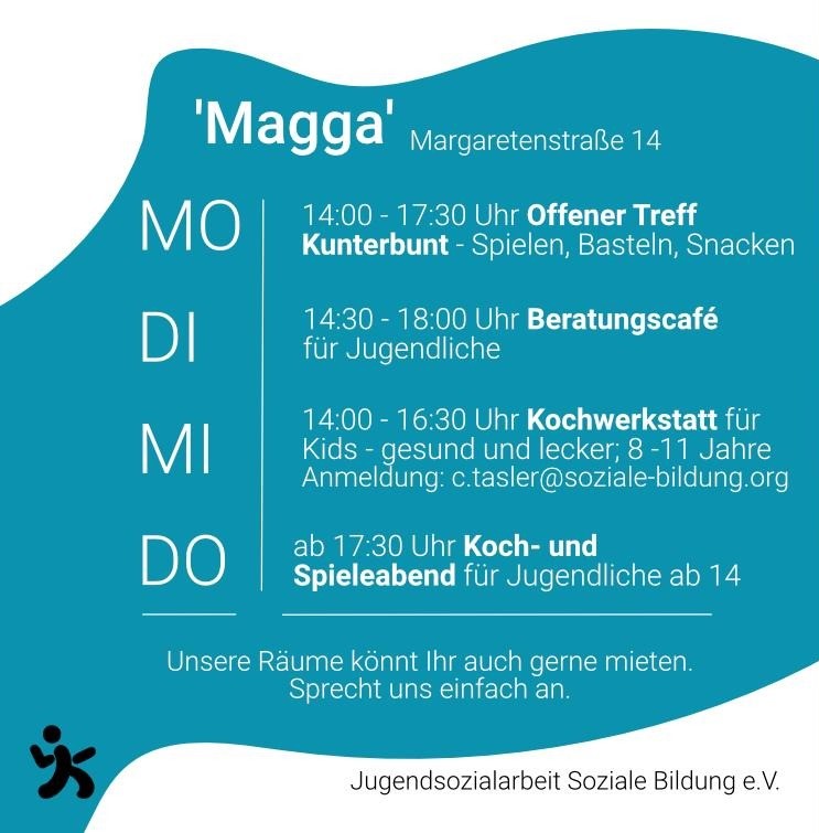 Seit 2020 haben wir außerdem zusätzliche Räumlichkeiten in der Margaretenstrasse 14 („Magga“), wo ebenfalls diverse Projekte der Offenen Kinder- und Jugendarbeit/Jugendsozialarbeit am Nachmittag und teils auch abends stattfinden. Räumlich angedockt an das Büro unserer Streetworker*innen finden hier insbesondere Angebote für Jugendliche statt.