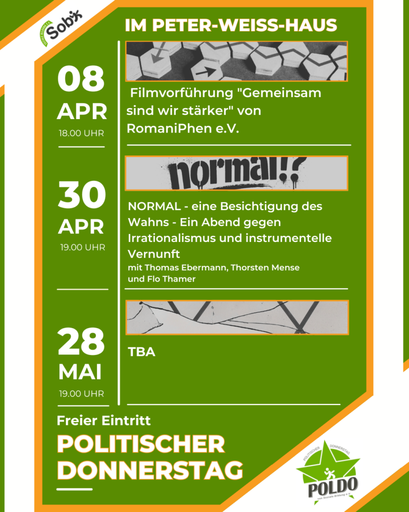 Die aktuellen PolDo Themen findet ihr in der Veranstaltungsübersicht des Peter-Weiss-Hauses.