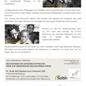Phoenix e.V. hält die Teilnehmerinnen dazu an, sich nach dem Konzept der Critical Whiteness, des kritischen Weißseins, mit ihrer Rolle im System des Rassismus auseinanderzusetzen. Im Alltag werden diese Prägungen durch Medien, durch Zusammensein in Familie, Beruf und Freundinnenkreis immer wieder bestätigt. Die politische Alltagskultur verstärkt zudem diese Klischees.