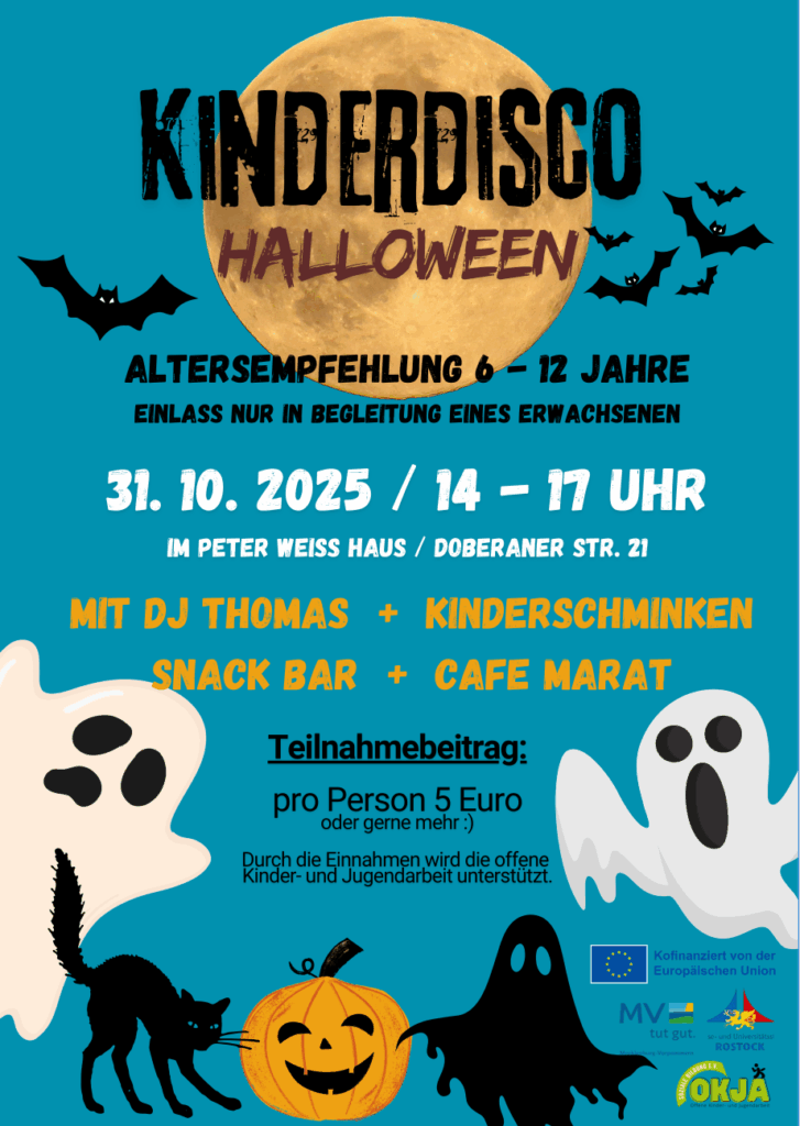 Am 31.10. startet wieder die große Kinderdisco im Peter-Weiss-Haus. Von 14 bis 17 Uhr wird es wild im Halloween Haus. Euch erwartet eine Snack Bar, Kinderschminken und DJ Thomas legt auf.