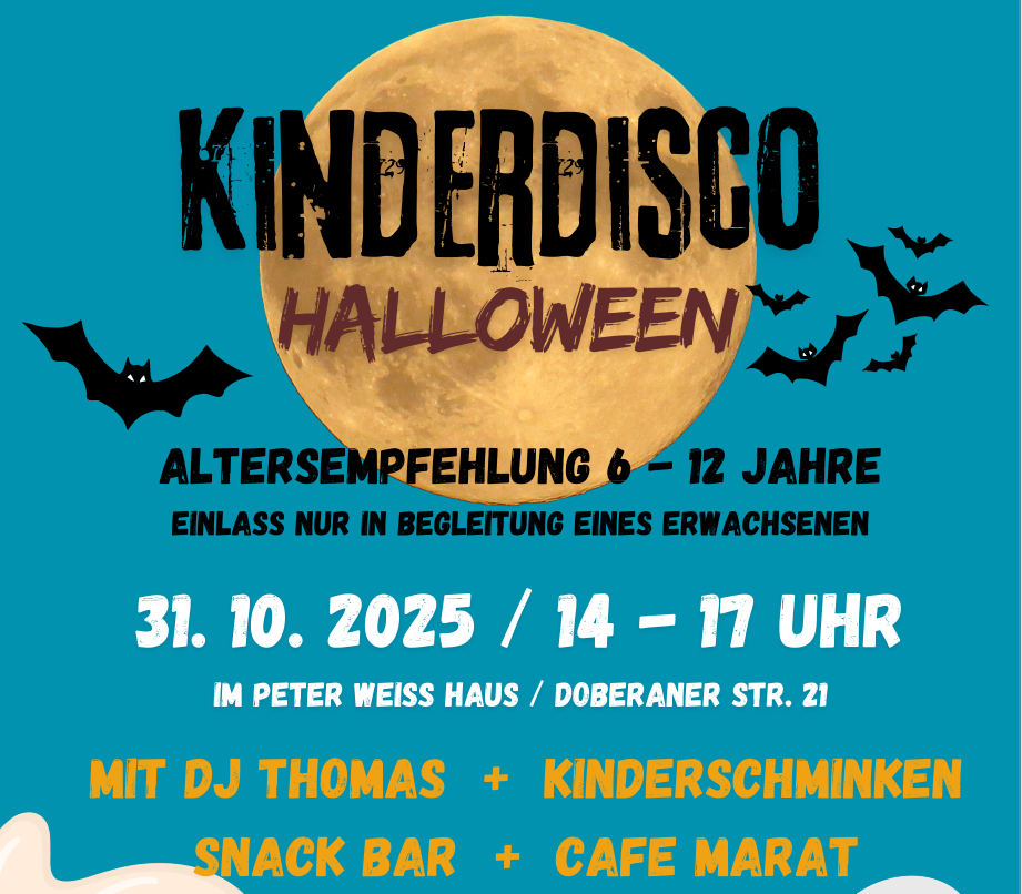 Am 31.10. startet wieder die große Kinderdisco im Peter-Weiss-Haus. Von 14 bis 17 Uhr wird es wild im Halloween Haus. Euch erwartet eine Snack Bar, Kinderschminken und DJ Thomas legt auf.