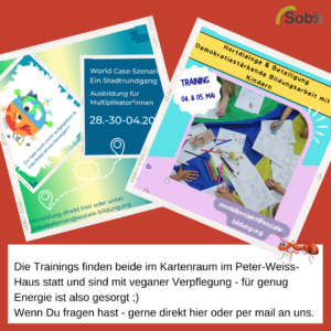 Natürlich freuen wir uns auch in 2025 auf die Beteiligung unserer Multiplikator*innen und freuen uns über Zuwachs im Team. Bei Interesse – einfach eine mail an das jeweilige Projekt oder bildung@soziale-bildung.org